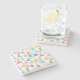 A stone coaster with a fun and colourful pattern. Research scientist vibe with beakers and flasks of different shapes and sizes in bright happy colours.