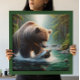 A painting showcasing a bear and a fish gracefully intertwined in a river. The bear is reaching out towards the fish as it elegantly swims against the current, creating a harmonious and captivating scene.