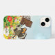 This charming iPhone 13 case features a whimsical illustration of a bear and a raccoon enjoying a peaceful picnic in a colourful flower field. With a backpack by its side, the bear sits upright, nibbling from a container, while the raccoon lounges contentedly, munching on a delightfully long sandwich.