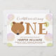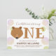 Our little bear is turning one first baby birthday invitation. This invitation is brown, white, pink, and green with the word "One" in large letters with a bear face illustration as the first letter of the word and pink and green balloons. Simply customise this invitation, add it to your cart, and happy birthday to your wonderful baby!