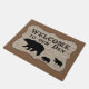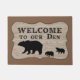 This is a cute door mat which is perfect for a cabin or woodland home. It features a faux wood grain banner with a black mama bear and two cubs. The text above the bear images says "Welcome to our Den". The banner is placed on a solid medium brown background.