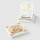 The coasters are gorgeous, a quality feel and heavy weight. They look like a precious archeological find. A rustic stone juxtaposed with a modern floral black and white print. I like the way the print goes slightly imperfect on the cut stone edges giving them a kind-of natural beauty.