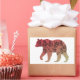 This design is the outline of a bear with a red or maroon to beige colour gradient and the silhouette of a tree inside.