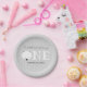Our little bear is turning one first baby birthday paper plates. These plates are white and grey with the word "One" in large letters with a polar bear face illustration as the first letter of the word and a pine tree background. Simply, customise these plates, add them to your cart, and happy birthday to your wonderful baby!
