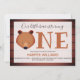 Our little bear is turning one first baby birthday invitation. This invitation is brown and white with the word "One" in large letters with a bear face illustration as the first letter of the word and a wood background. Simply, customise this invitation, add it to your cart, and happy birthday to your wonderful baby!