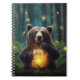 Big black bear in a dark forest with a glass jar filled with fireflies.