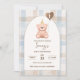 Celebrate your little one's special day with this adorable Beary First Birthday Invitation! Featuring a soft watercolor gingham pattern in blue, green, and brown, this charming invite sets a cozy, whimsical tone for a birthday celebration. A sweet watercolor teddy bear, holding a heart-shaped balloon with the number "1," adds an extra touch of cuteness. The cream arch backdrop ties everything together for a look that's both playful and elegant.