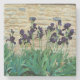 A bed of deep purple bearded iris’s showing the blue beard, set against a limestone wall
