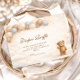 Soft, sweet, and timeless, this teddy bear baby shower design features a charming storybook bear holding a delicate balloon beneath a scalloped heirloom frame. The warm neutral palette of cream, soft blue, and gentle beige creates a cozy nursery-inspired aesthetic that feels both classic and elevated. Subtle gingham details and tiny star accents add a touch of vintage charm without overwhelming the layout. Perfect for a baby boy shower or a neutral celebration with a traditional, heartfelt feel.