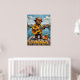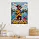This charming artwork features a bear dressed as a firefighter, complete with a helmet and sunglasses, playing an acoustic guitar on a wooden dock. A jar of honey sits nearby. The background shows a serene lake, mountains, and a blue sky with fluffy clouds. The painting uses thick, textured brushstrokes, giving a whimsical and heartwarming feel, with "Love My Honey" written below.