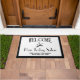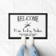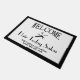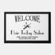 Comb and scissors framed welcome mat includes text areas for business name and two lines for contact information at bottom