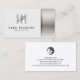 This beautician business card features an elegant silver damask background on the right side of the card. Your monogram letter appears in an elegant script font over a simple square silver background. Your name and title lie below the monogram letter, over a soothing off-white coloured background. Perfect for fashion, beauty, ladies, women, artistic cosmetics, makeup themes.