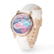 An elegant rose gold watch with a beautiful pink and blue liquified abstract design. This pretty watch comes with an elegant white leather wristband. The watch face has a text message. Text and photos are customisable, and can be easily personalised to fit your needs. This unique and beautiful watch is the best gift for your wife, girlfriend and mum. Great gift for birthday, wedding, anniversary, holiday, Valentine’s Day, Mother’s Day , and for yourself!