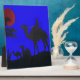 The "Beautiful Amazing Sunset Camel Safari Art Print/Design" is visually striking and evokes a sense of wanderlust and adventure. The strong contrast between the vibrant blue background and the bold black silhouettes creates a dramatic effect that captivates the viewer.