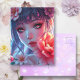 Anime postcard. A beautiful girl with pink eyes, flowers and musical notes glitchcore art. Purple and pink floral accents.