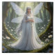 A beautiful fairy wearing a flowing white dress and a necklace made of diamonds with daisies and diamonds in her long silvery-white hair and iridescent white dragonfly-like wings holding a daisy stands in a magical forest surrounded by daisies and moss covered trees.