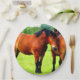 Horsey themed paper plates. A photograph of a beautiful pair of stocky looking work horses. These polish bred horses are a deep bay colour with black manes and legs. Set against a lush green background of trees and grasses.