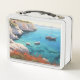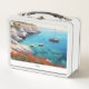 Nice white lunchbox with beach in Greek Islands travel holiday in Europe.