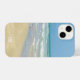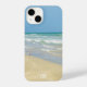 Beautiful beach monogram iPhone 14 case with gorgeous seaside photography featuring a pretty sandpiper standing at the edge of the ocean waves on a sunny summer day. Lovely blue green water waves roll onto the sandy shore where your custom text is personalised in lovely white cursive typography. A beautiful island gift.