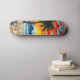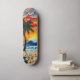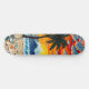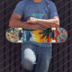 Beach art skateboard. An impasto oil painting style ai illustration of a beach full of palm trees, sea glass, sea shells and ocean waves at sunset. A bright colourful mesh of colours make this coastal art vibrant and beautiful!