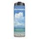 This thermal tumbler features a storm cloud brewing in the horizon over a tropical blue sea. This coastal seashore thermal tumbler has it all, blue sky, white clouds, aquamarine ocean and sandy beach while the surf breaks along the shoreline. Personalise this personal piece of beachfront property with her Name for a beautiful gift of oceanview.