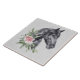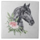 Ceramic tile with a beautiful illustration of a black horse head with a fancy floral bouquet by it's neck. Elegant and classy animal painting. Grey mottled background.