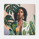 This acrylic painting portrait features a fashionable, elegant brown-skinned girl in an indoor setting, flanked by monstera deliciosa and other houseplants. The gorgeous classy lady has curly hair and wearing plant-inspired clothing. A contemporary nature-inspired artwork in shades of green and orange. Great for boho decor.