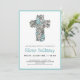 Floral baptism invitation with a cross filled with blue and pale flowers, greenery, and berries. Blue baptism invitation with pretty flowers and your son's name in a charming turquoise font. Boy baptism invitation with a blue floral cross.