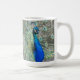 Large size, ceramic coffee mug for your hot or cold beverages that features the photo image of a beautiful, blue Peacock with colorful fantail feathers. Image printed on both sides of mug. Select your mug style and color.