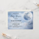Baby shower invitation with a moody blue sky with clouds and a big beautiful moon. 2 white swans flying off together.