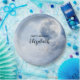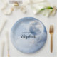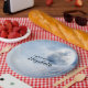 Paper plates with a magical fantasy sky with fluffy blue clouds and a big beautiful moon. 2 white swans flying off together.