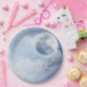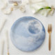 Paper plates with a magical fantasy sky with fluffy blue clouds and a big beautiful moon. 2 white swans flying off together.