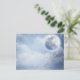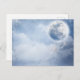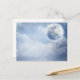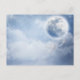 A postcard with a scenic moody blue sky with clouds and a big beautiful moon. 2 white swans flying off together.