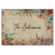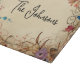A whimsical floral border of red, purple, and blue flowers edge this cutting board giving it a boho aesthetic. Name can be changed. AI assisted graphic purchased with commercial license. Artwork: RavenPrintableDesign