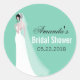 A beautiful bride in her gown with the bride's name and other text. Personalise with your information for a custom sticker. Great for bridal shower favours and other events surrounding the wedding. You can change the aqua background colour to the colour of your choice.