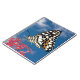 A close up photo of a colourful butterfly feeding on a flower against a blue sky background.