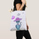 Unique bag with a beautiful cat in a hat and flying saucers only on the front side on starry white background. The heavenly cat is in light blue colour wearing a violet hat.