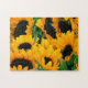 The cheerful beauty of sunflowers in lush bloom presents a challenge in this jigsaw puzzle that is available in a variety of sizes, levels of difficulty and prices.