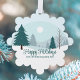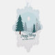 A beautiful winter landscape with teal green pine trees and snow covered ground on personalised business holiday ornament cards. Customise these company Happy Holidays snowflake shaped card with your own corporate message on the back in elegant cursive script.