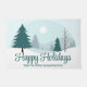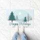 A beautiful winter landscape with teal green pine trees and snow covered ground on a personalised business holiday door mat. Customise this company Happy Holidays decor with your own corporation name.