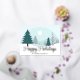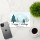 A beautiful winter landscape with teal green pine trees and snow covered ground on personalised gold foil business holiday postcards. Customise this company Happy Holidays postcard with your own corporate message on the back in elegant cursive script.