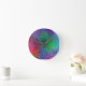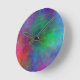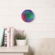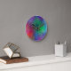 ROUND WALL CLOCK. ENTIRE FACE IS A BEAUTIFUL ABSTRACT CLOUD OF GREEN, BLUE, PINK, PURPLE