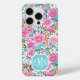 Customize this gorgeous modern colorful flower garden of flowers in pink, orange, aqua, and yellow iPhone 15 pro case with your your initials in a modern CAP font in white on blue. It's so vibrant and happy!