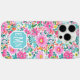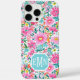 Customise this gorgeous modern colourful flower garden of flowers in pink, orange, aqua, and yellow iPhone 16 pro max case with your your initials in a modern CAP font in white on blue. It's so vibrant and happy!