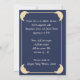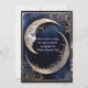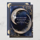 A beautiful and serene face in a crescent moon, inside a gold frame on a dark blue gradient background makes an exquisite Halloween party invitation. The back is a complementary shade of blue, with a white-gold frame and crescent moons on the corners, with plenty of space for additional text.