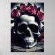 A dark and gothic painting of a human skull surrounded by pale gothic roses and petals, featuring a creepy desaturated gothic atmosphere and otherworldly atmosphere, this gothic poster is perfect for lovers of dark gothic skulls and dark romantic gothic flowers and roses.