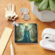 A beautiful fairy wearing a flowing turquoise-coloured dress and a necklace made of turquoise stones with turquoise and holly in her long turquoise hair and iridescent dragonfly-like wings holding a holly branch stands in a magical forest surrounded by grass, rocks and vine-covered trees.