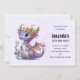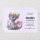 Birthday invitation with an illustration of a mythical dragon. Purple and blue scales. A flowered gold crown with horns adorns its head. Magical, fun and friendly.