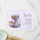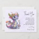 Thank you card with an illustration of a mythical dragon. Purple and blue scales. A flowered gold crown with horns adorns its head. Magical, fun and friendly.