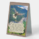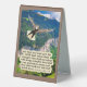 Beautiful Eagle Scripture Table Tent Sign of a colourful, detailed scene with a glorious Bald Eagle spreading its wings and flying high in the blue sky above a plush green valley next to the foothills of a mountain. This scene accompanies the Bible verse, "But they that wait upon the LORD shall renew their strength; they shall mount up with wings as eagles; they shall run, and not be weary; and they shall walk and not faint." Isaiah 40:31. This Table Tent Sign makes a wonderful gift or can be used to remind us of the Word of God.